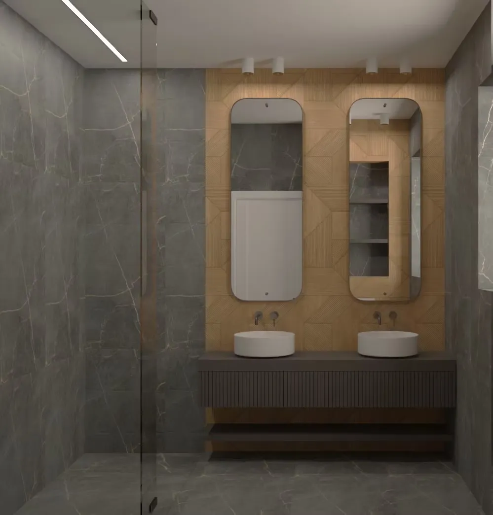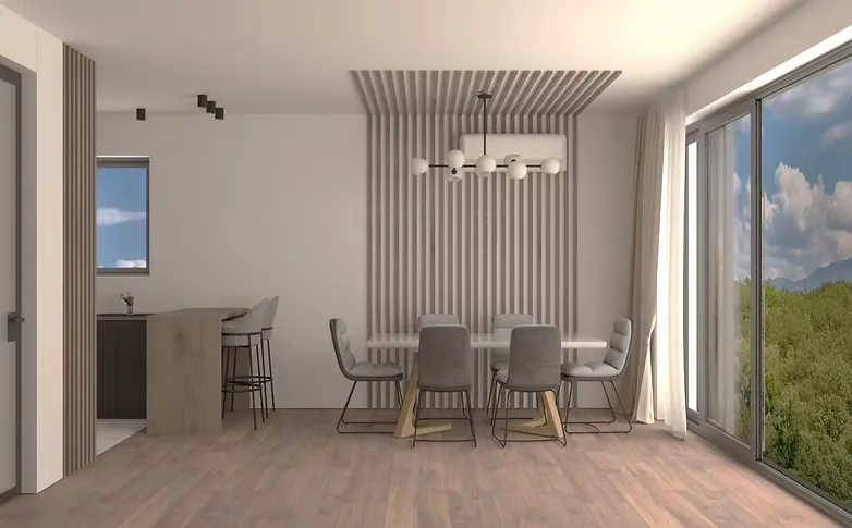 На първия етаж се намират отворена всекидневна, трапезария и модерна кухня, а вторият етаж е предназначен за спалните и личните пространства. Баните са стилни и практични, с интегрирани ниши и стъклени прегради. Тази къща предлага комфорт и съвременен стил за цялото семейство.